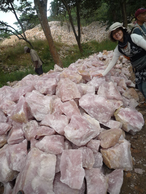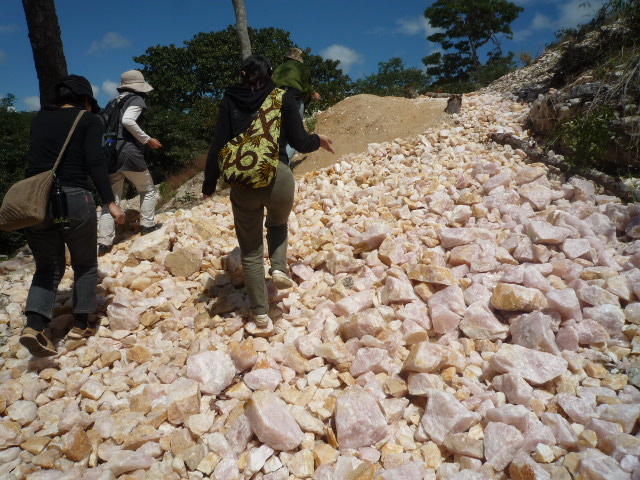 少し歩くと目の前に大量のピンクの石が転がっている! ローズクウォーツ!